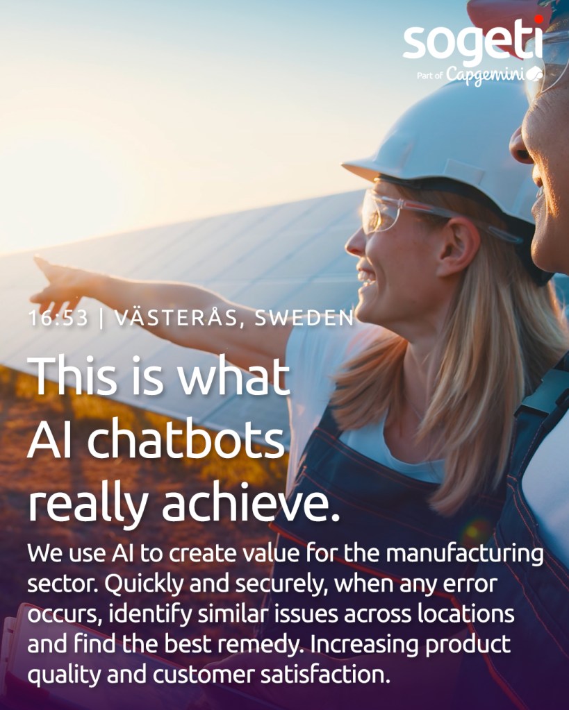AI på riktigt för den svenska tillverkningsindustrin. Med hjälp av AI och generativ AI, kombinerat med en robust dataplattform och avancerad analys av data från fabriksmaskiner och data samlad i molnet, hjälper vi industrin att ställa om produktionen snabbare när efterfrågan förändras. Våra lösningar används för att planera bättre, undvika fabriksstopp, förbättra OEE-rapportering och få en jämn kvalitet i produktionen. Vi ser också till att nya och befintliga produkter kommer ut snabbare i produktion. Alla är viktiga konkurrensfördelar som gör stor skillnad för våra svenska industriföretag. Med AI skapar vi värde snabbt och bygger lösningar som håller, både för idag och för framtiden.